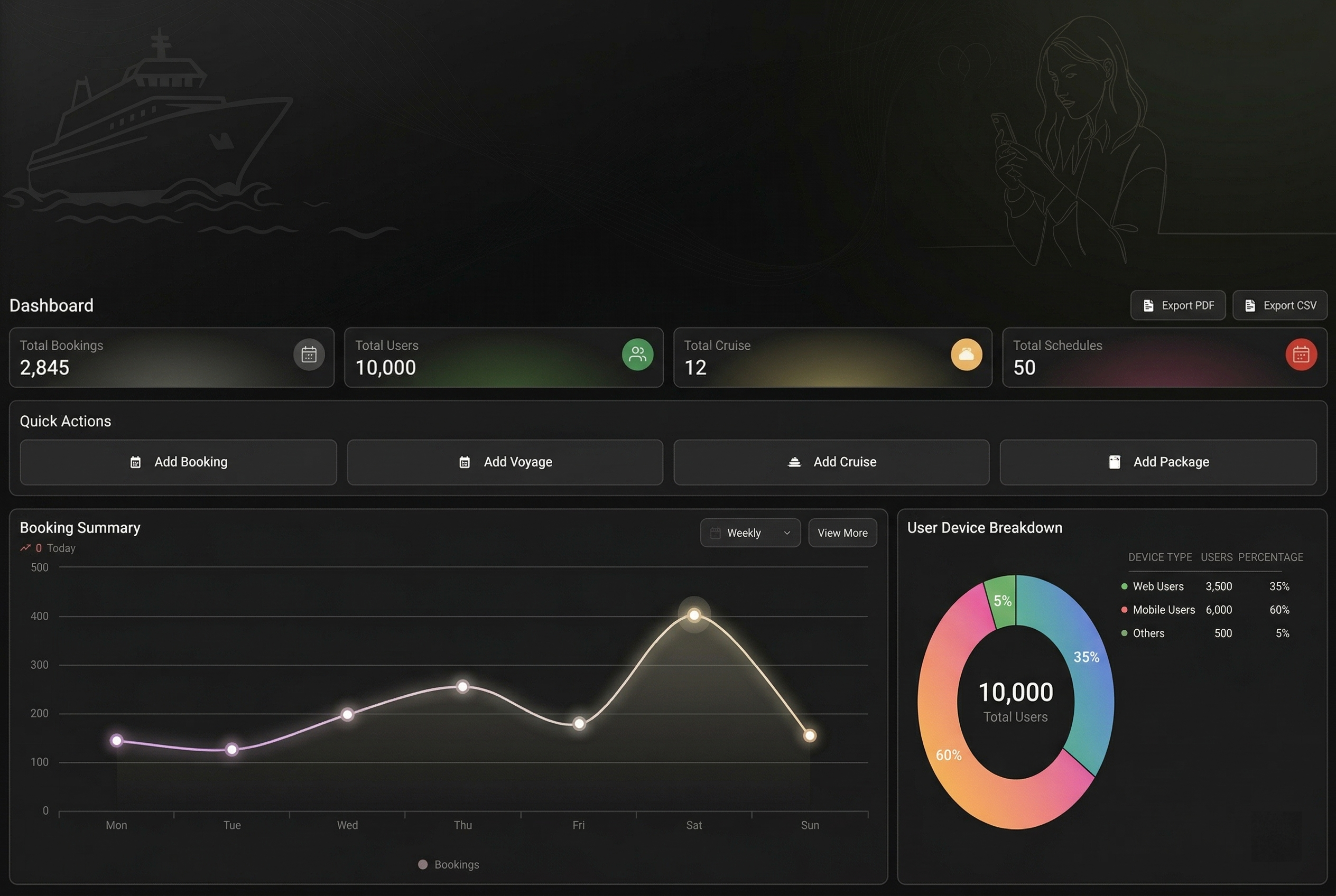 A fully integrated platform designed to manage end-to-end cruise operations, including bookings, onboard services, customer engagement, and financial transactions.