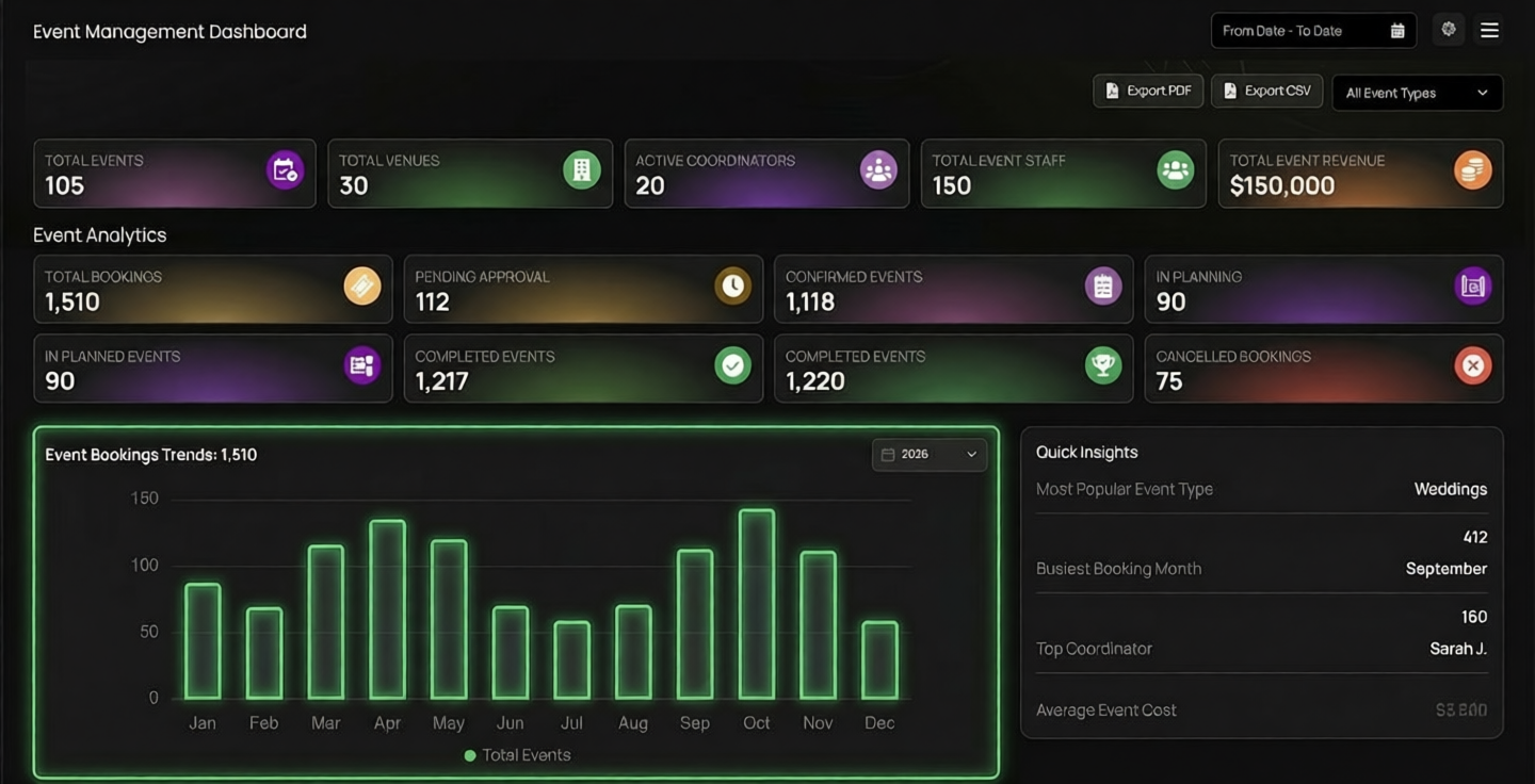A centralised solution to plan, manage, and execute events seamlessly with real-time tracking and coordination.